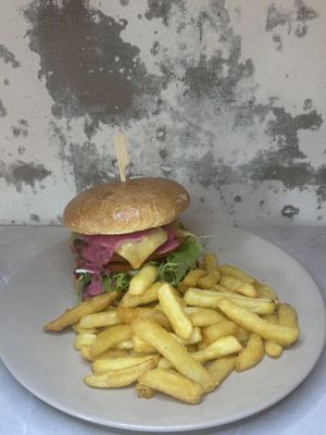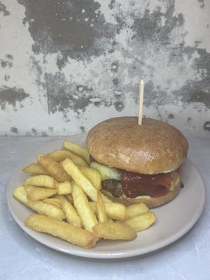 Our beef pattie served on a brioche bun, topped with cheese and tomato sauce. Served with chips.