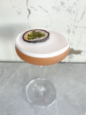 A shaken blend of vanilla vodka, passionfruit liqueur, and lime juice, balanced with pineapple and vanilla syrup garnished with passionfruit. Tropical, sweet & citrusy