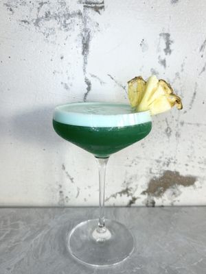 Midori and blue curacao layered with fresh pineapple juice and vodka, creating a smooth tropical cocktail with a striking ocean-green blue