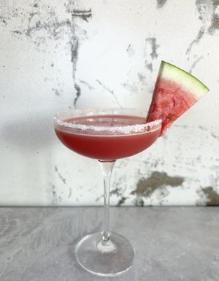 Freshly juiced watermelon shaken with vodka and lime juice, garnished with a slice of watermelon - bright refreshing and summery