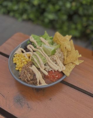 Pulled pork, homemade salsa, corn, black beans, lettuce, brown rice, smashed avo & corn chips drizzled with chipotle