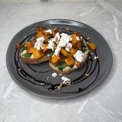 Two pieces of toasted seeded sourdough topped with whipped feta, roast pumpkin, wilted baby spinach, pinenuts & crumbled feta - GF available