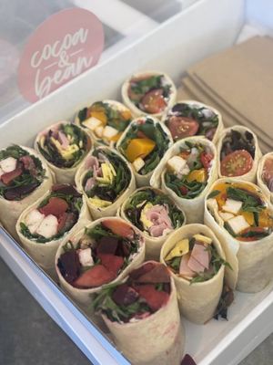 Includes 6 wraps cut into quarters. Filling includes: Smoked salmon, whipped feta, cucumber, cherry tomatoes & lettuce Morrocan chicken, whipped feta, capsicum, pumpkin, mixed lettuce Grilled Chicken & roast veggies- onion, beetroot, roast potato, whipped feta & mixed lettuce Ham, cheese, tomato relish & mixed lettuce Orders will only be accepted when placed with 48 hours notice
