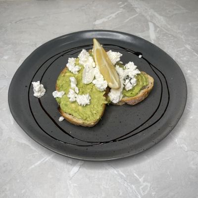 Two pieces of toasted seeded Sourdough topped with Smashed Avo, Crumbled Feta & a slice of Lemon - GF available