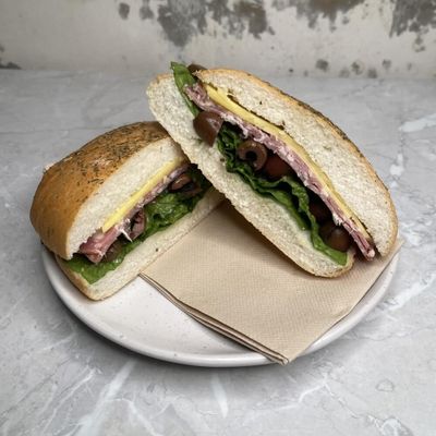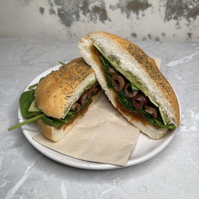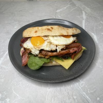 Bacon & Fried Eggs served on a Turkish Roll with mushrooms, Spinach, Cheese, Aioli and Homemade Tomato Relish - GF available