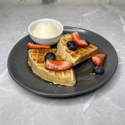 Classic Waffles served with seasonal fruit, maple syrup and vanilla ice cream