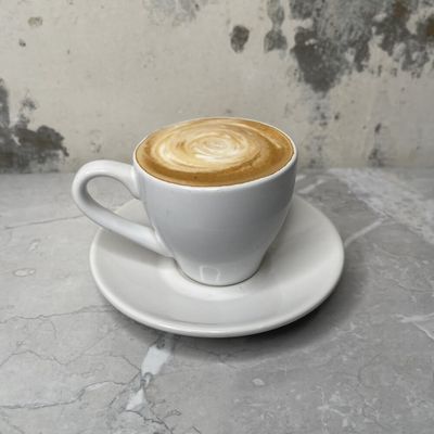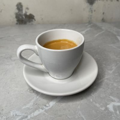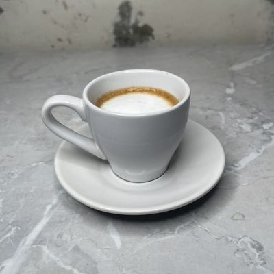 A shot of coffee topped with steamed milk, foam & chocolate sprinkle