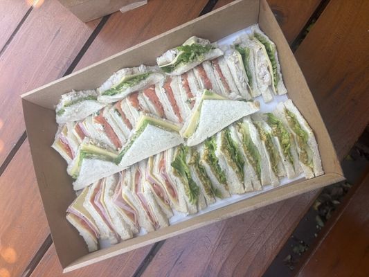 Includes 8 sandwiches cut into quarters. Fillings include: Curried egg & lettuce Ham, cheese & tomato Chicken, avocado, aioli & cheese Smoked salmon, creme fraiche & cucumber Orders will only be accepted with 48 hours notice.