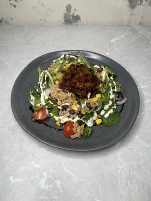 Spicy Pulled Pork, Mixed Salad, black Beans, Corn, Cherry Tomatoes, Red Onion, Avocado, Brown Rice & Creamy Lime Aioli - GF