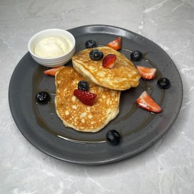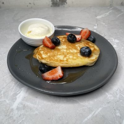 Classic pancakes served with seasonal fruit, maple syrup and vanilla ice cream