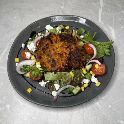 Served on a bed of salad topped with a Cucumber, Cherry Tomato, Corn, Red Onion & Crumbled Feta
