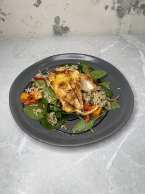 Grilled Moroccan Chicken, Roast Pumpkin, Pine Nuts, Red Capsicum, Red Onion, Baby Spinach & Brown Rice GF