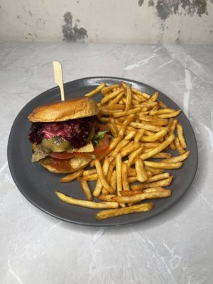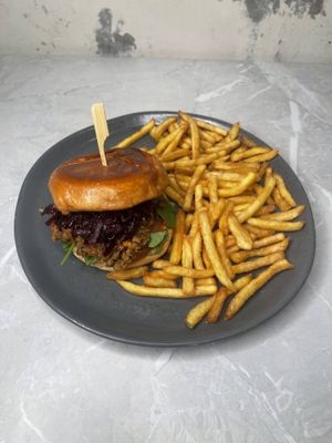 Seasoned Beef Pattie, Melted Cheese, Tomato, Lettuce, Beetroot Relish, Tomato Relish with Cocoa & Bean Sauce