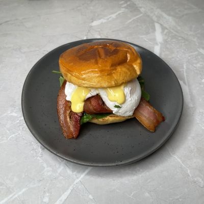 Poached Eggs, Bacon, Baby Spinach & Hollandaise Sauce on a Brioche Bun - GF available