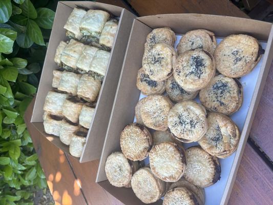 Hot food platters includes our best selling pies & rolls. Box includes 9x mini sausage rolls 9x mini spinach & ricotta rolls 6 x mini chicken & leek pies 6 x mini beef pies includes tomato & BBQ sauce orders will only be accepted with 24 hours notice.