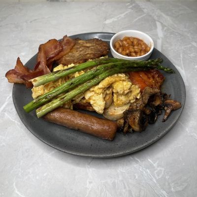 Two eggs cooked your way (Poached, scrambled or fried) with Bacon, Sausage, Baked beans, Garlic Butter Mushrooms, Homemade Hash Brown, Asparagus & Grilled Tomato served with Buttered Seeded Sourdough with your choice of sauce - GF available