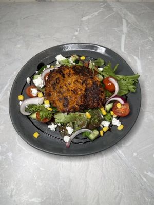 Served on a bed of Salad topped with a Cucumber, Cherry Tomato, Corn, Red onion & Crumbled Feta